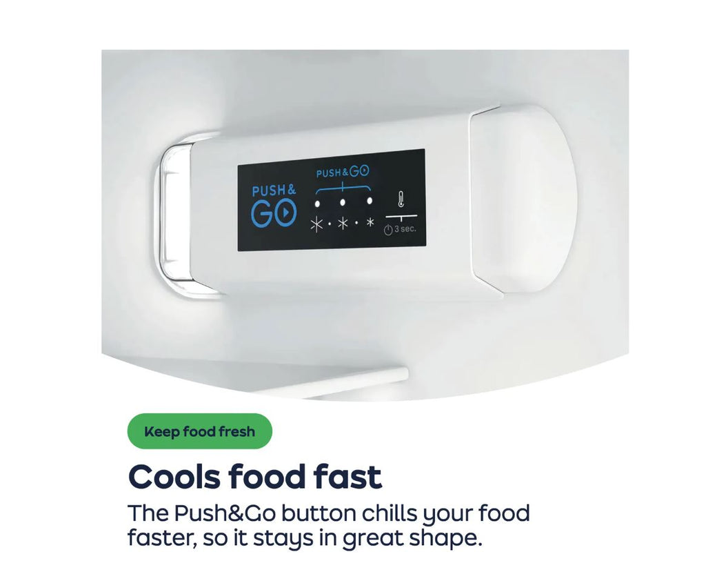 This Indesit American fridge freezer has bags of tech to look after your food. When you’ve just come back from the weekly shop, the Push&Go setting will drop the temperature quickly to lock in nutrients and flavours. Your favourite treats never tasted so good. And you’ll never open the doors to find ice covering those precious goodies, because Total No Frost sees off any buildups by keeping a steady temperature in the cabinets. This model has adjustable shelves too, so there’s plenty of flexibility to make sure everything fits in. No more squished cakes and wedged bottles.