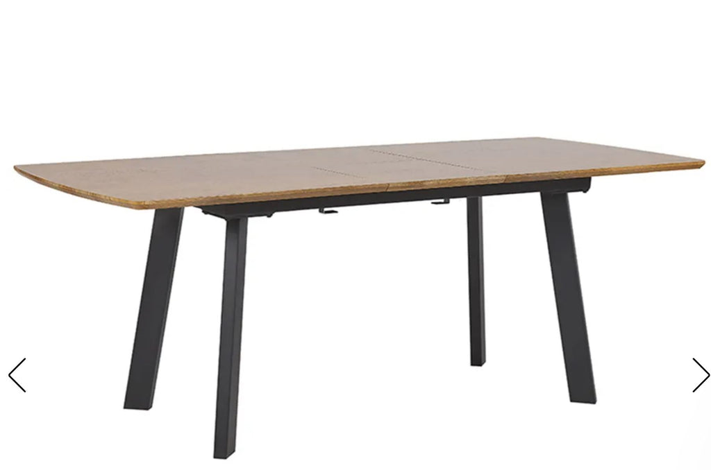 Complete your dining room or kitchen with this sleek dining table. It makes a natural centrepiece and offers a wide surface for eating, working or playing. Thanks to the smartly hidden traditional mechanism it can be easily extended when you need more table top space. The pattern of grains and knots on the dark wood top and black metal legs add a truly rustic charm.