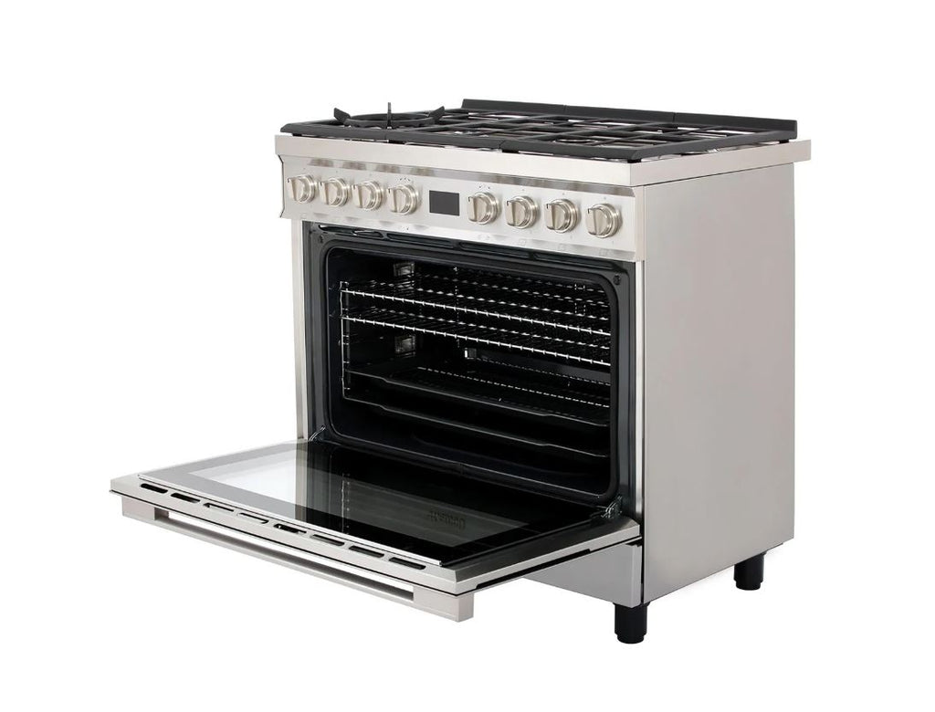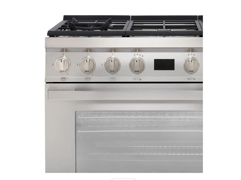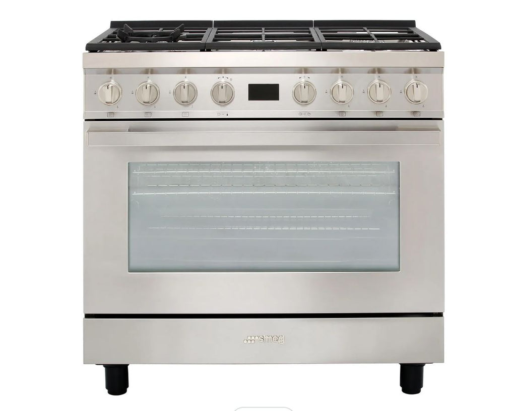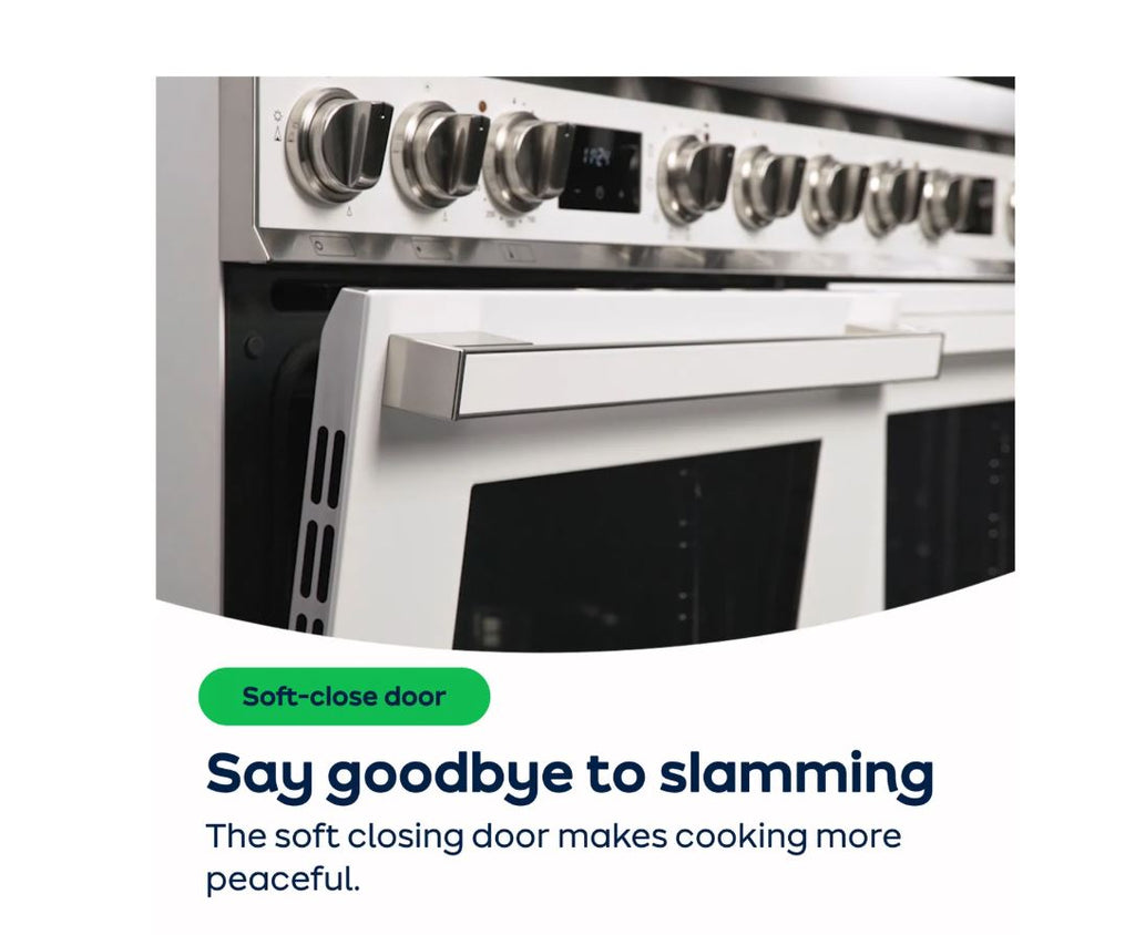 This Smeg dual fuel range cooker is the ultimate kitchen companion. Sporting a roomy oven and 6 burners, it’s never been easier to whip up a multi-course masterpiece. Clever Circulaire tech cleans the air to stop flavours transferring while spreading heat evenly across every shelf, so your moist madeira cake won’t taste like the meaty mains. And if you love crunchy crusts but hate a hot kitchen, Closed Door Grilling is right up your street. Safer and more efficient, you can get the same great results without the risk of banging your shins. Plus, whether you’re a bit of a clumsy cook or your date is on their way, the Soft Closing Door means you can’t accidentally slam it shut. That’s one less thing to worry about.
